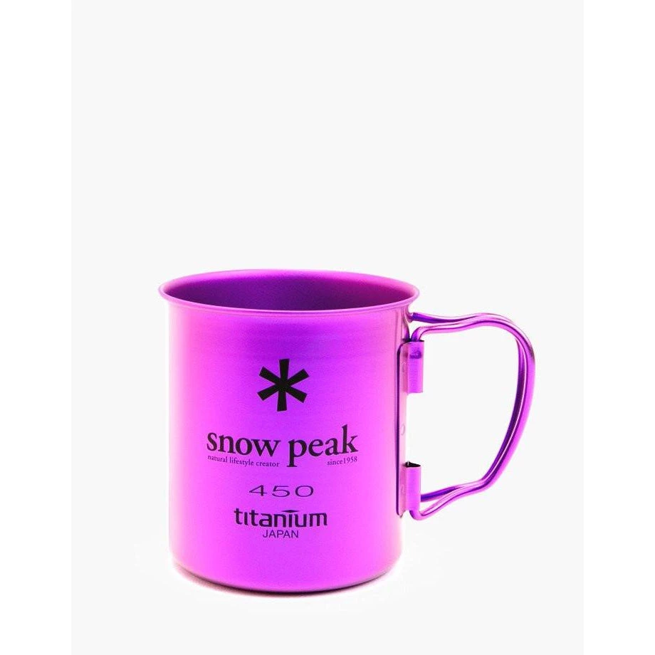 Snow Peaks ultralight single-wall titanium cups done in brilliant anodized colors, this mug can be used directly over a flame, and features folding handles for easy packing.