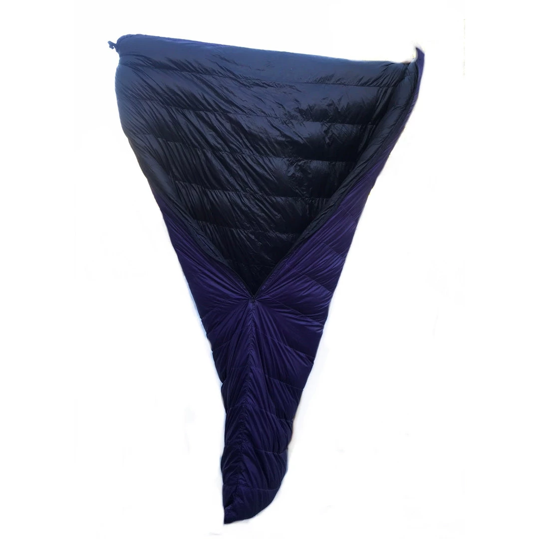 The 2 Foot Adventures three-season quilt is conservatively rated to 0°F (-17.777ºC). The quilt has a sewn footbox and zips all the way to the top, similar to a sleeping bag. The top of this ultralight down quilt has a  snap and draw string for maximum flexibility. On warm nights we prefer to sleep with the quilt unzipped and snapped at the top. On cold nights we zip up and cinch the top to reduce cold air flowing into the bag.