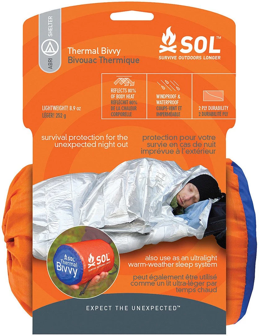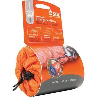 Ideal for those occasions when you take a wrong turn and are forced to spend the night. Made out of a quiet, reusable, and repairable bright orange polyethylene material. Survival and first-aid instructions are printed directly on the blanket. Reflects up to 90% of your radiated body heat.