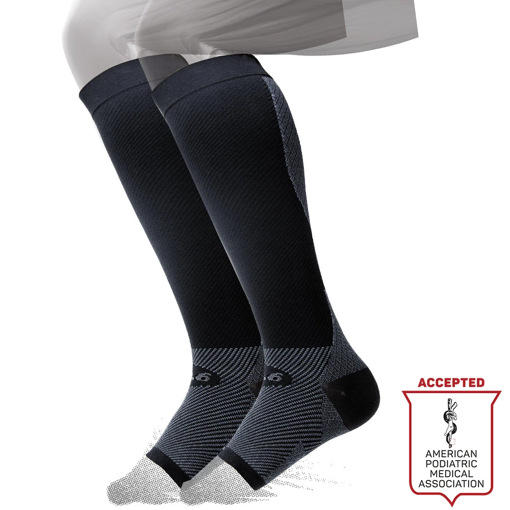 The FS6+ Performance Compression Leg Sleeve relieves Plantar Fasciitis, Shin Splints, Leg Cramping and Achilles Tendonitis with one light, comfortable foot+calf compression leg sleeve.