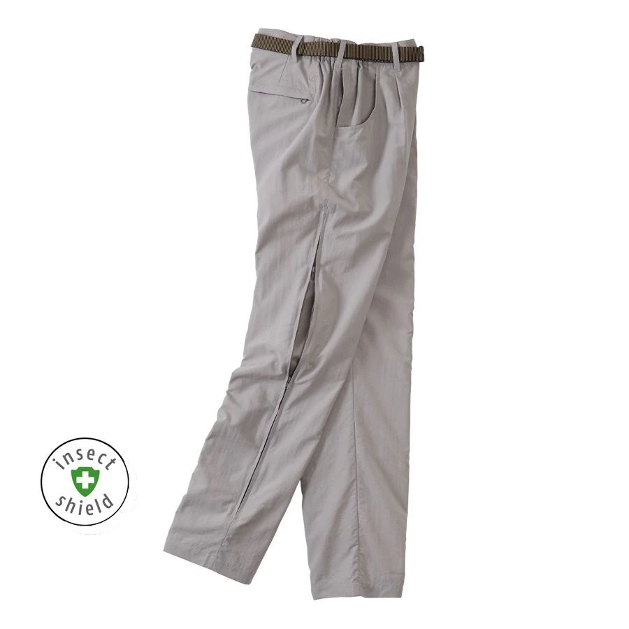 Are you really interested in long pants for the desert, jungle, or backcountry that are superlight, tough, and airy? With the Eco-Mesh Pants, you now have amazing temperature regulating features. Constructed out of two-ply, 3-oz. Duralite nylon fabric, the tricked-out elements are 27-inch side zippers concealed behind vertical bands, which provide air flow to that one troubling hot spot encountered by most hikers: the crotch. Behind the tucked-away zippers are soft-mesh panels whose duty is to funnel air in and around your nether regions. With the zippers closed, the abrasion- resistant Eco-Mesh Pants resemble a traditional pair of khakis. Because the fabric is now treated with Insect Shield® technology, you have protection against mosquitoes, biting flies, and ticks. The fit is enhanced by elastic side panels at the waist, and sports two on-seam front pockets, 2 zippered back pockets. Super packable, with a 15-minute maximum drying time. Includes a new side-zippered security pocket.